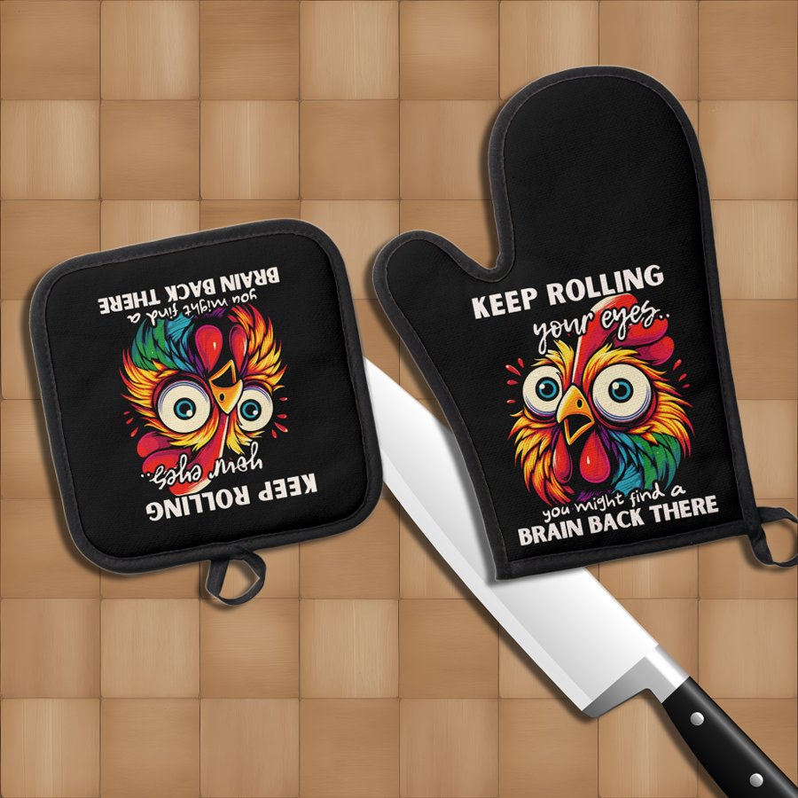 Funny Chicken Rolling Eye Quote Oven Mitt & Pot Holder Set